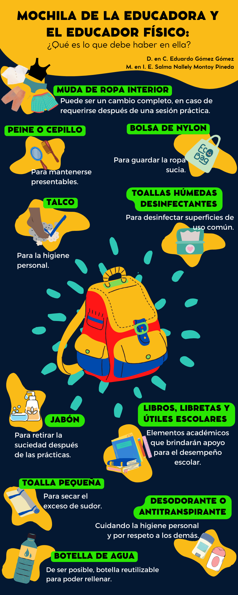 La formación de licenciados en educación física tambien incluye la formacion de hábitos y valores de higiene y comportamiento. La infografía "La mochila del educador físico" es un documento que se expone desde que los caracteriza como profesionistas